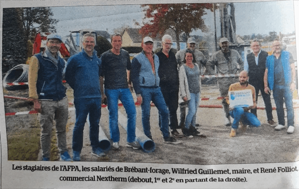 Ce chantier exemplaire a réuni plusieurs acteurs locaux, dont Brébant Forage pour la réalisation des forages, l’AFPA de Coutances dans le cadre d’une formation professionnelle, et Nextherm, fournisseur de la pompe à chaleur géothermique installée sur site.